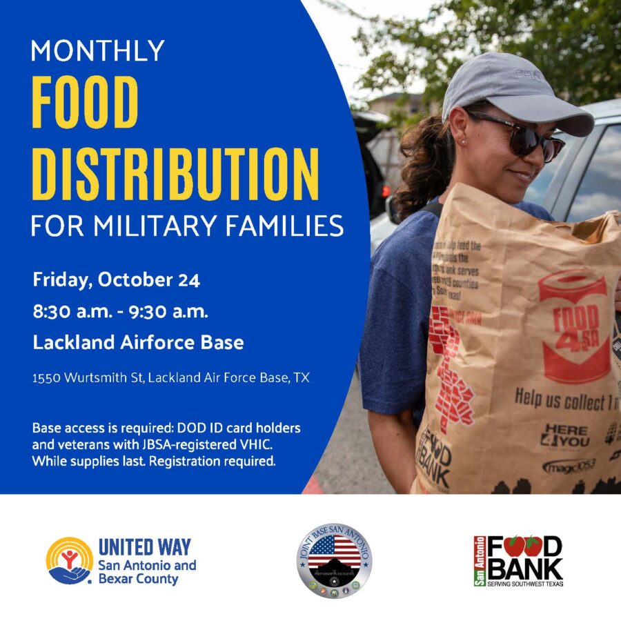 FOR IMMEDIATE RELEASE –United Way of San Antonio and Bexar County will launch a series of monthly food distribution events for military families this Friday on Joint Base San Antonio – Lackland. Part of United Way’s Mission United work, this recurring food distribution will be open to all service members, veterans and their families who have base access.